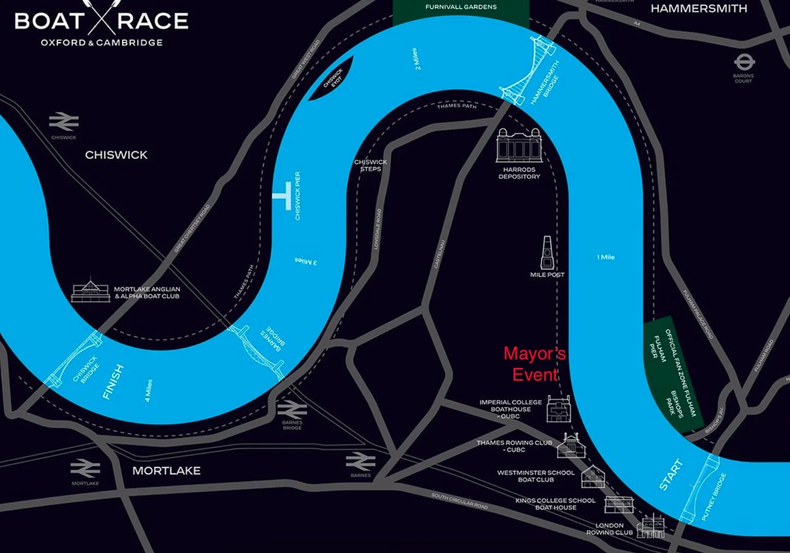 Many surrounding streets will be closed for the race. We strongly recommend using public transport. The nearest station is Putney Bridge.